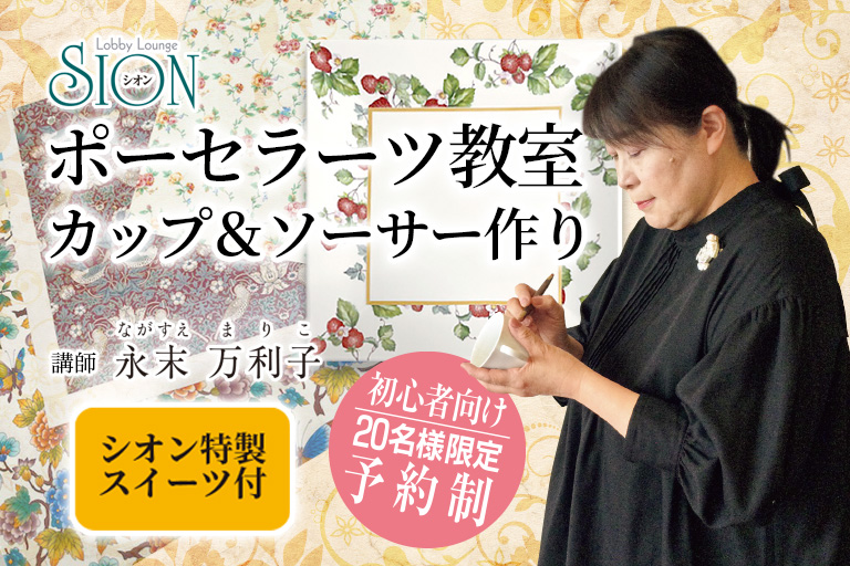 毎年好評のポーセラーツ教室。今回は手作りのカップ&ソーサーを作ります。 ここにしかないお気に入りの作品に出会えるかも。初めての方も安心してご参加いただけます。 シオン特製デザートもお楽しみください。