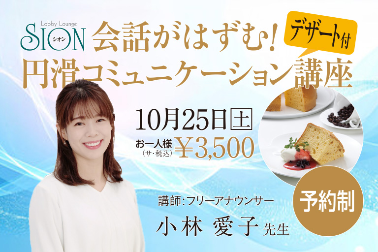 テレビ・ラジオ出演やイベント司会、講演などの豊富な経験を活かした講座が好評! 今回の下関グランドホテル カルチャースクールでは、自信を持って人前で話すスキルや、幅広い世代と円滑にコミュニケーションを取る方法を楽しく学べます。講座の後はシオンのデザートタイム!