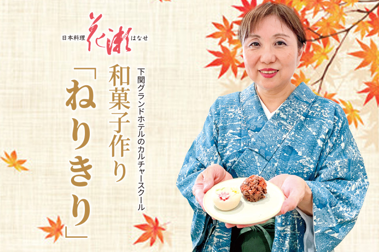 今回の下関グランドホテル カルチャースクールは、作る楽しさと味わう喜びをひとときに味わえる講座。紅葉した葉や木枯らしの風情を表現した練り切り二種を手作ります。 ホテルランチの後は、ご自身の和菓子をデザートに。
