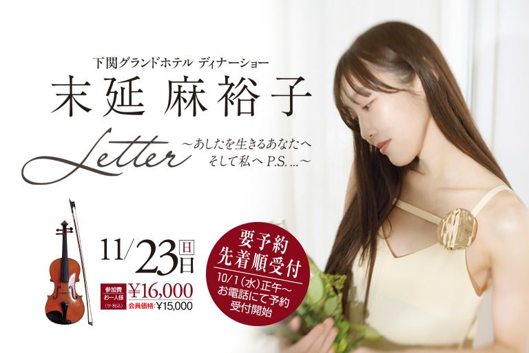 昨年11月、秋色に彩られたステージから1年。今年も下関グランドホテルに末延麻裕子が帰ってまいります。 今回のディナーショーは、10月に光市で開催されるコンサート『Letter 〜あしたを生きるあなたへ、そして私へ〜』の“追伸(P・S・)”として企画されました。 朗読と演奏で綴られた本編に続き、この夜は本人の言葉で想いを語りかけ、音楽と共に「手紙」を届けます。