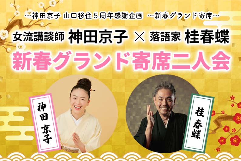 -   2026年1月12日(祝) 予約制 ~神田京子 山口移住5周年感謝企画 ~新春グランド寄席~ 落語 桂春蝶・講談 神田京子 新春寄席二人会昨年、一昨年と「神田京子独演会」を開催し、多くのお客様に「笑いあり涙あり」の感動をお届けさせて頂きました。今回は、京子さんが何度も高座をご一緒されている近年大注目の落語家・桂春蝶との「新春寄席 二人会」をお楽しみいただきます。令和8年の初笑い!ぜひお楽しみください。