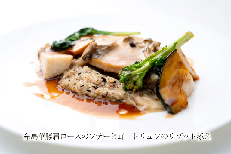 ⑷糸島華豚肩ロースのソテーと茸 トリュフのリゾット添え(※写真)