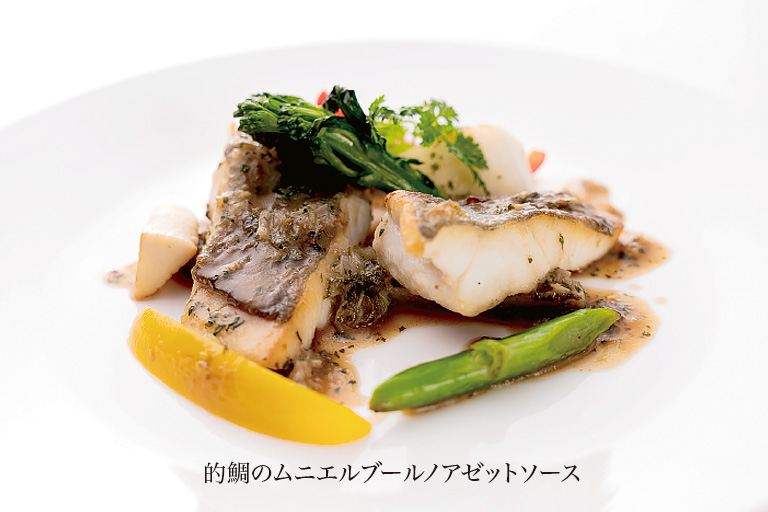 唐戸市場直送的鯛のムニエル 菜の花のクーリ 青菜とセロリの温かいサラダ