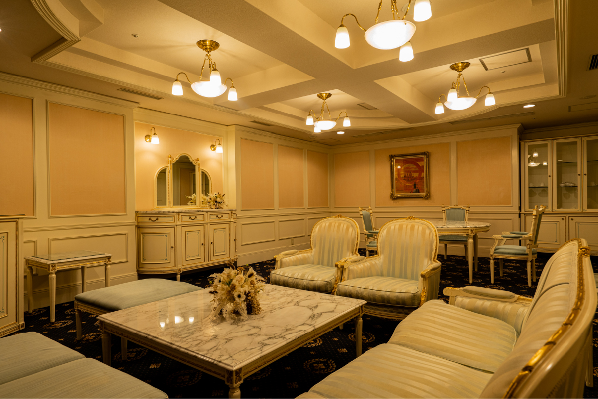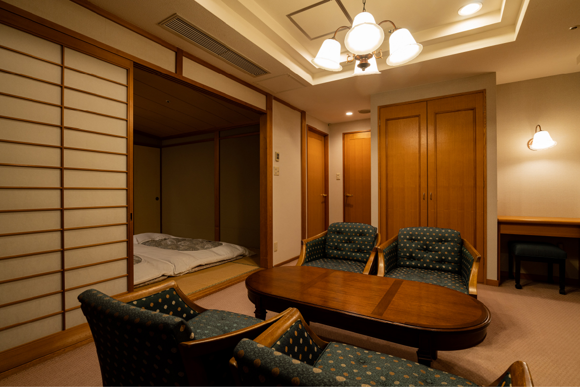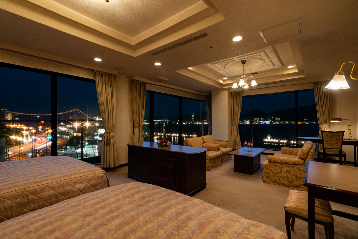 関門海峡が一望できる角部屋。座り心地にこだわった上質のソファで、とびきりリラックス。格調高い調度品は、優雅な気分を誘います。